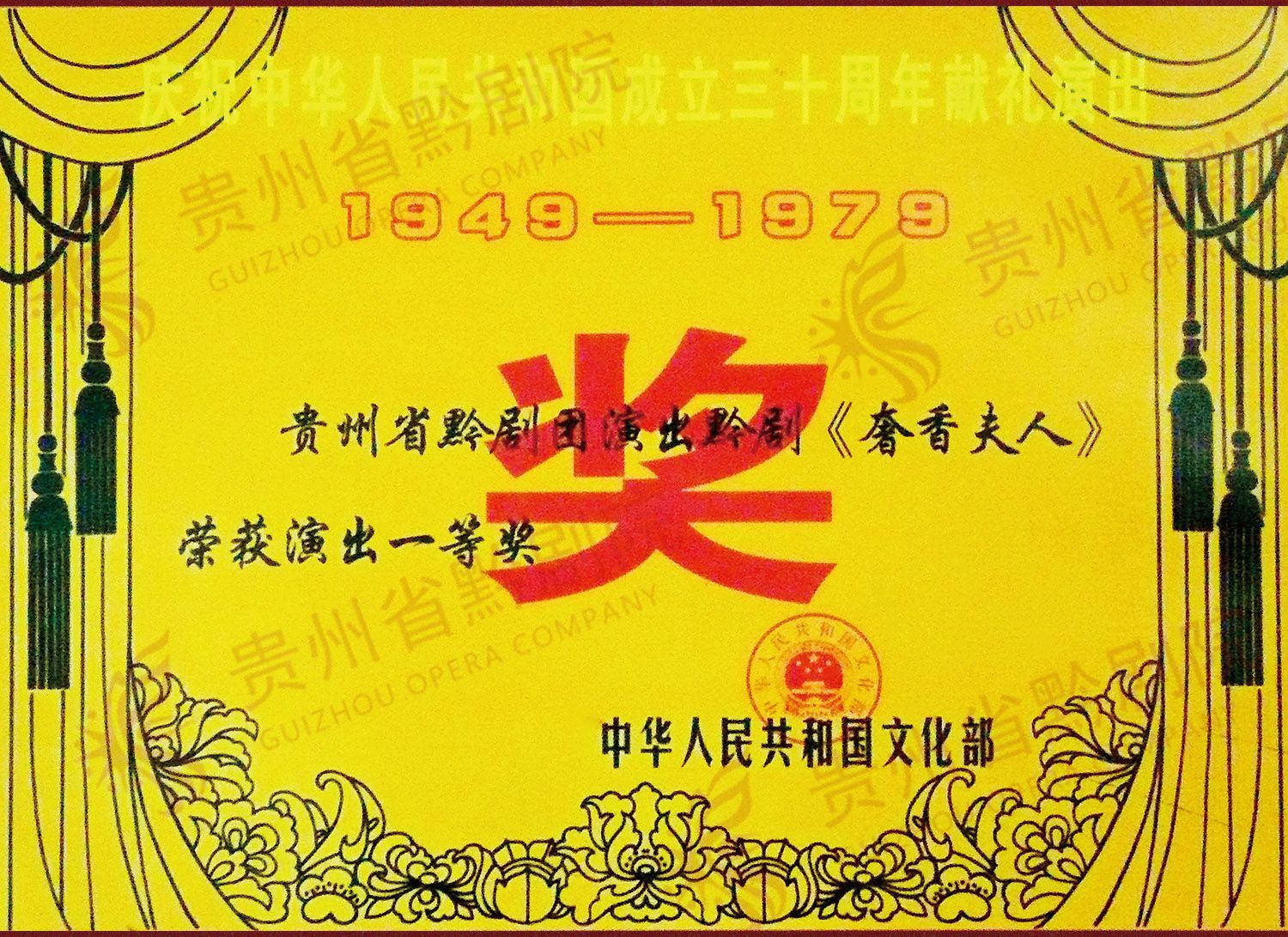 1949 - 1979黔劇團演出黔劇《奢香夫人》獲演出一等獎 | 《天渠》第十六屆中國文化藝術(shù)政府獎文華大獎 |
