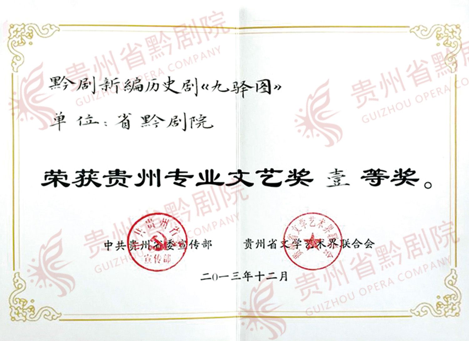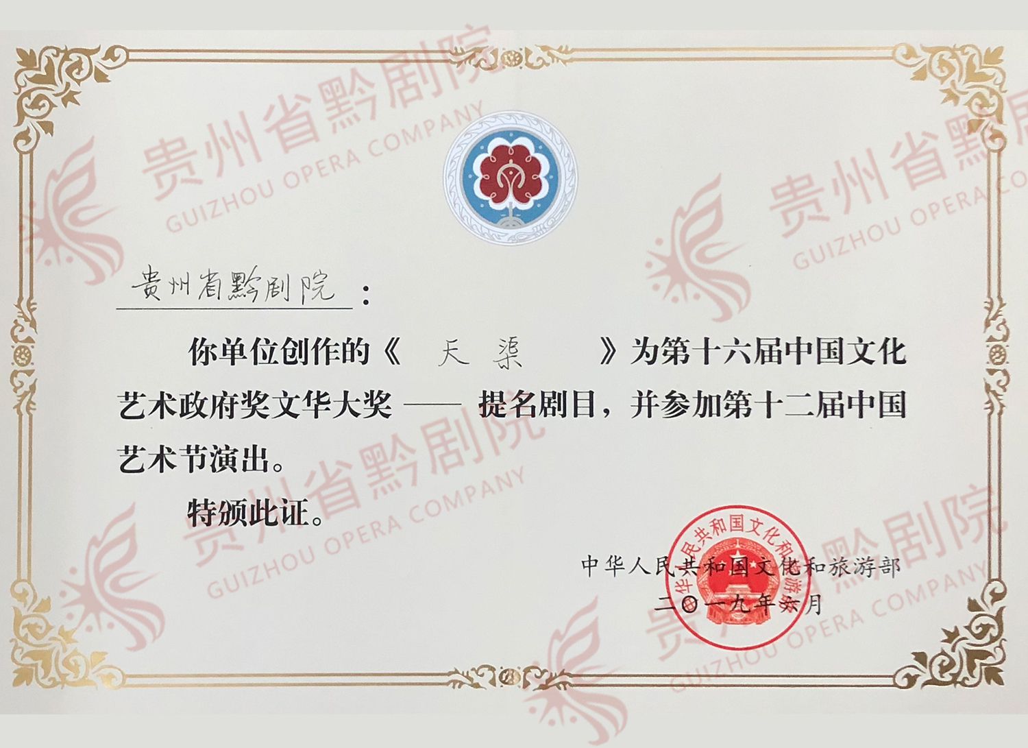 2019中國(廣州)演出經(jīng)紀(jì)人大會評選中黔劇《天渠》榮獲金獎 | 黔劇院,《九驛圖》獲貴州專業(yè)文藝獎壹等獎 |