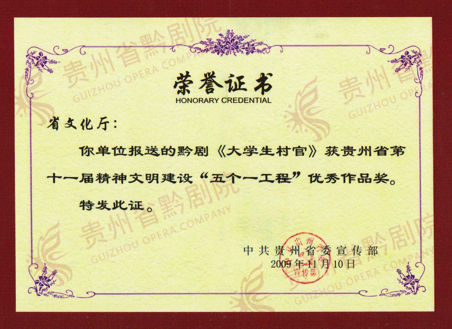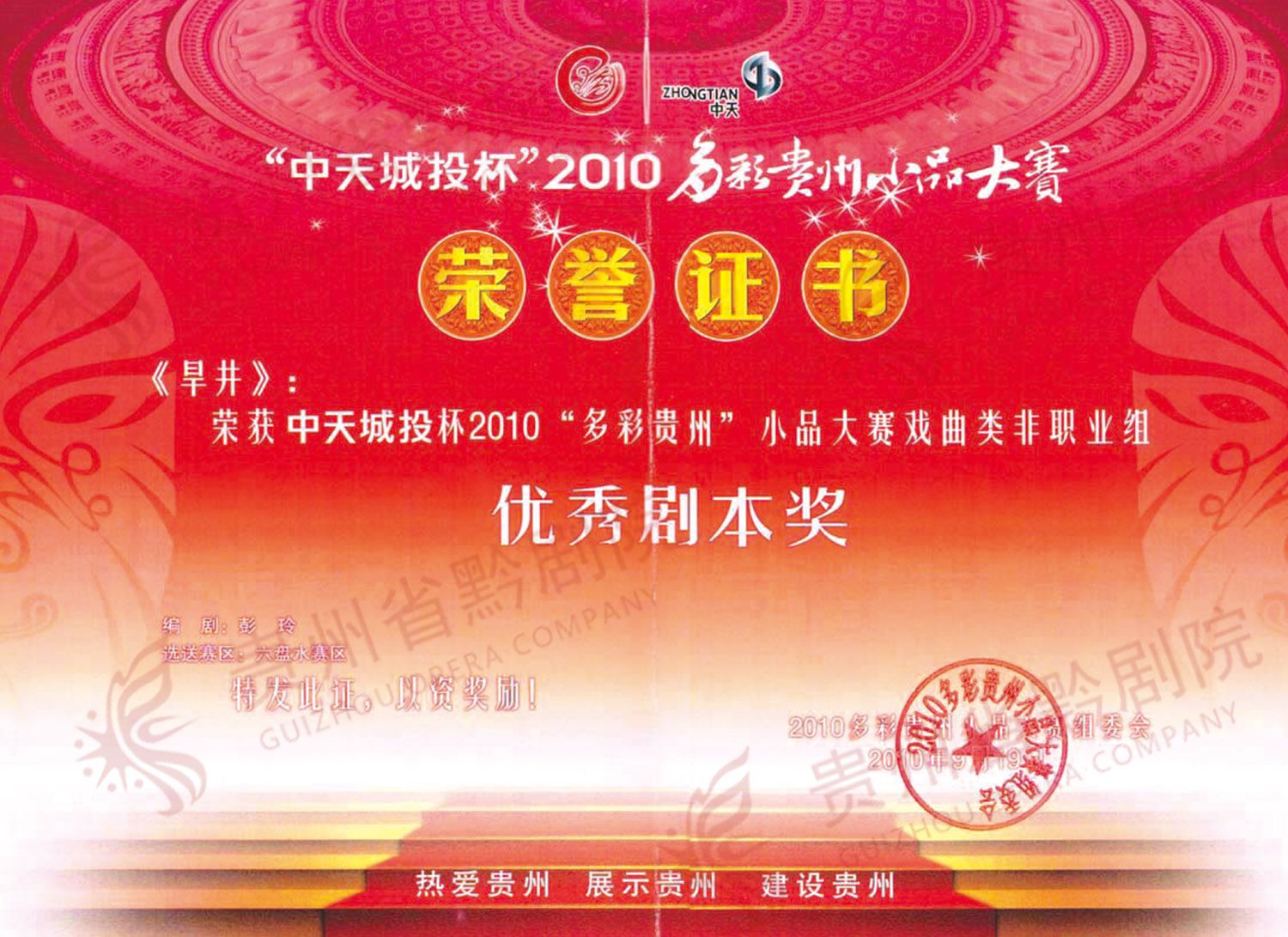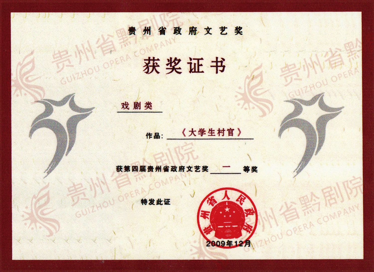 《旱井》榮獲中天城投杯2010“多彩貴州”小品大賽優(yōu)秀劇本獎 | 《大學(xué)生村官》獲第四屆貴州省政府文藝獎一等獎 |