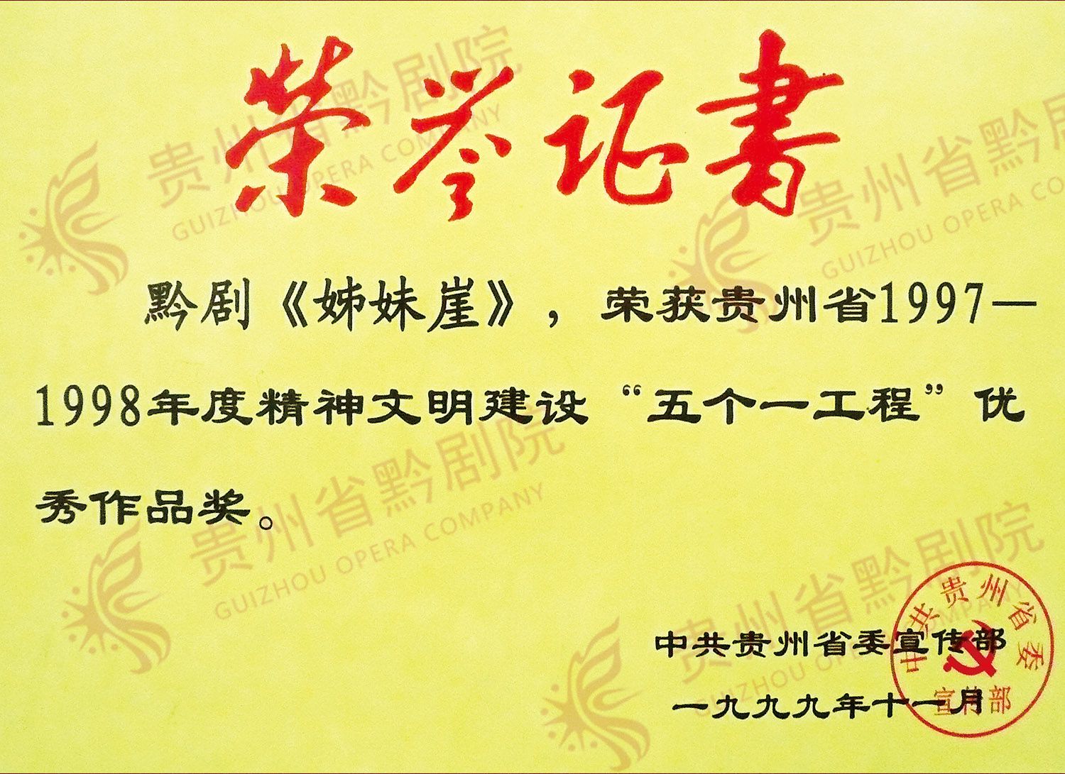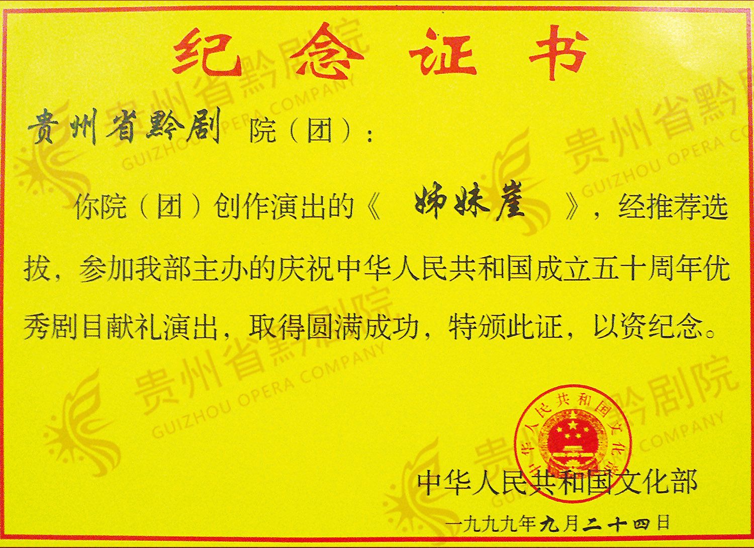 《姊妹崖》,獲1997 -1998年度精神文明建設(shè)“五個一工程”優(yōu)秀作品獎 | 《姊妹崖》參加,慶祝中國成立五十周年獻禮演出,圓滿成功,特頒此獎,以資紀(jì)念 |