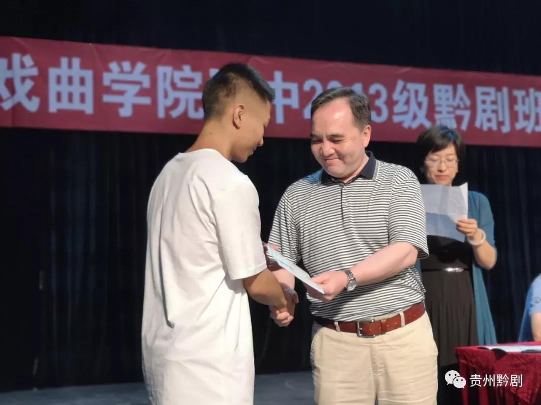 9日上午,由省文旅廳領(lǐng)導、我院領(lǐng)導班子和中國戲曲學院附中校方領(lǐng)導參加的,國戲附中2013級黔劇班畢業(yè)典禮在我院排練廳隆重舉行,并由國戲附中張可來副校長親自為畢業(yè)生們頒發(fā)畢業(yè)證書。省文旅廳副巡視員王寧出席了畢業(yè)典禮并代表廳黨組做了發(fā)言。