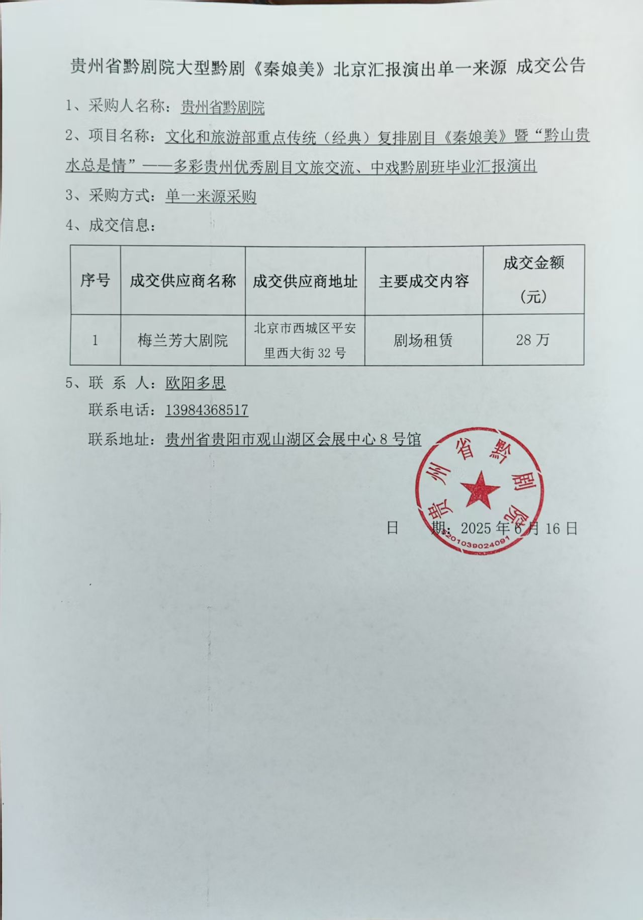貴州省黔劇院大型黔劇《秦娘美》北京匯報(bào)演出單一來源成交公告