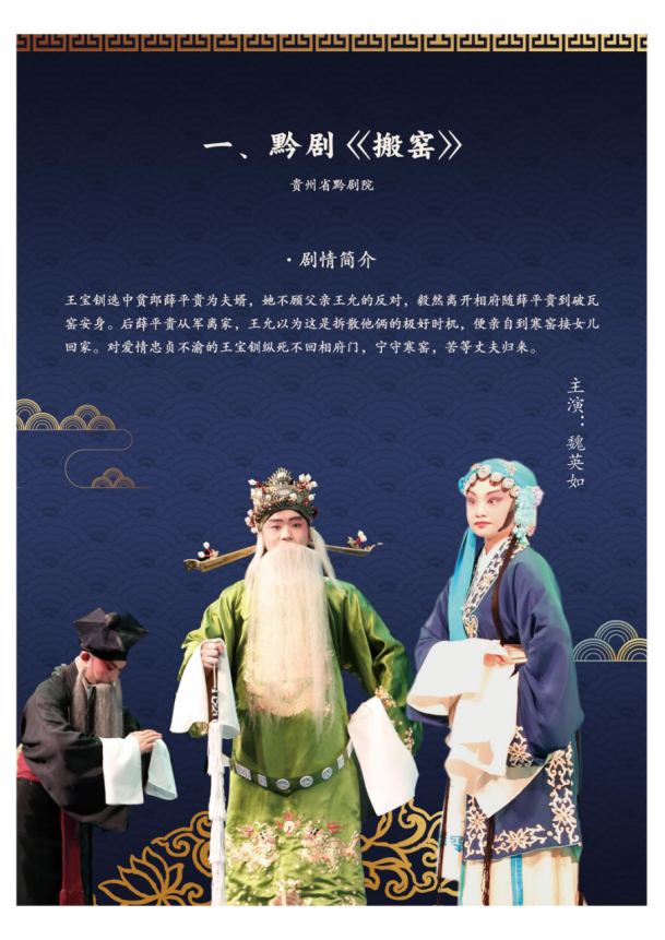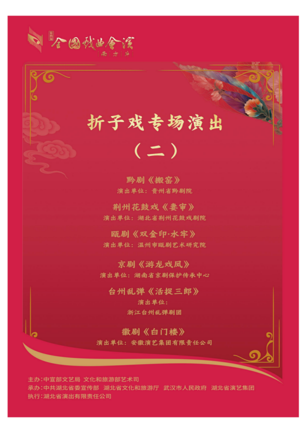 此次會演由中宣部文藝局,文化和旅游部藝術司主辦,中共湖北省委宣傳部,湖北省文化和旅游廳,武漢市人民政府,湖北省演藝集團承辦。匯聚了來自全國16個省(區、市)的17臺優秀保留劇目和12位青年演員主演的傳統經典折子戲,黔劇《搬窯》作為貴州地方戲曲的代表之一,將與其他優秀劇目一同為觀眾帶來一場戲曲盛宴。