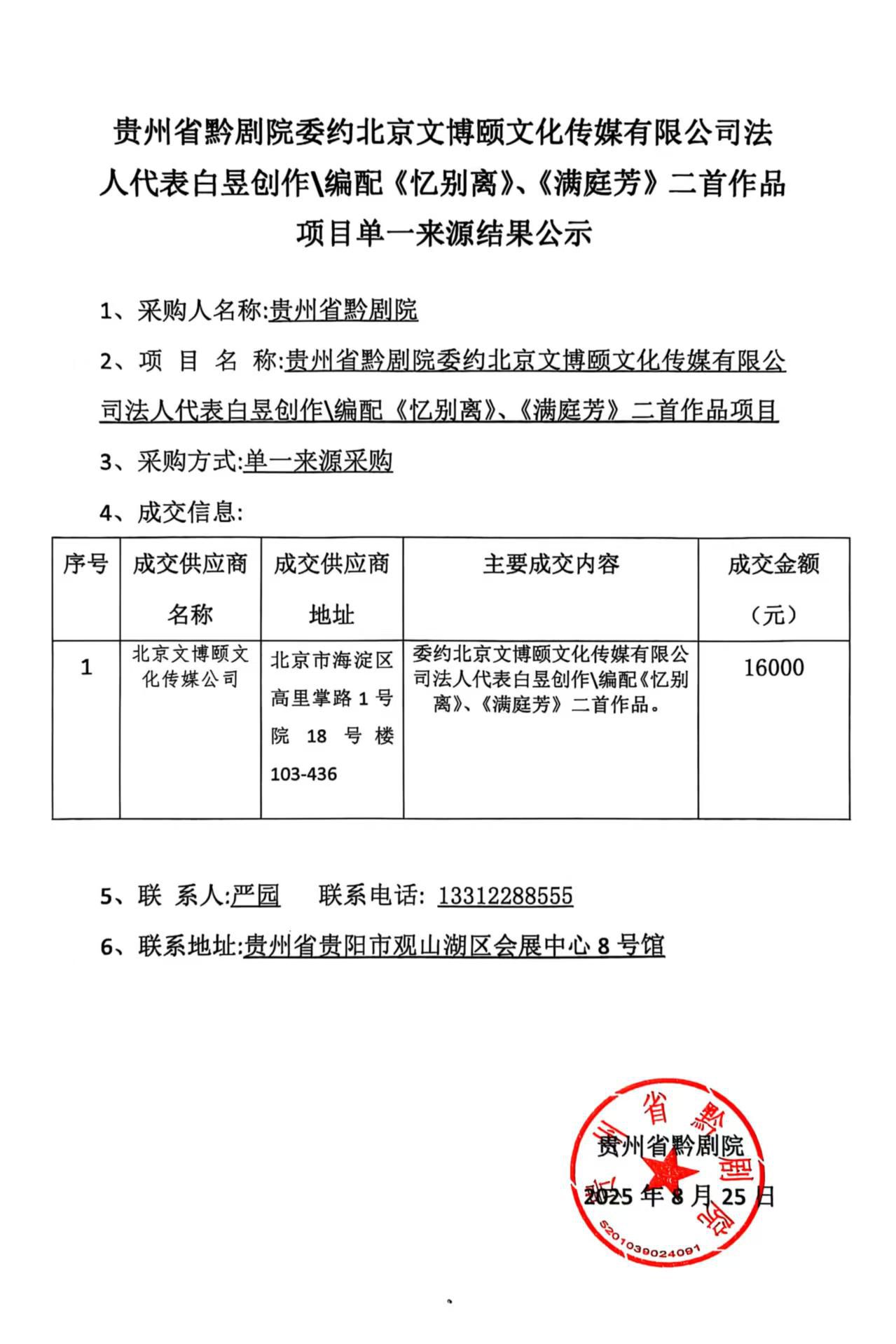 貴州省黔劇院委約北京文博頤文化傳媒有限公司法人代表白昱創作\編配《憶別離》《滿庭芳》二首作品項目單一來源結果公示