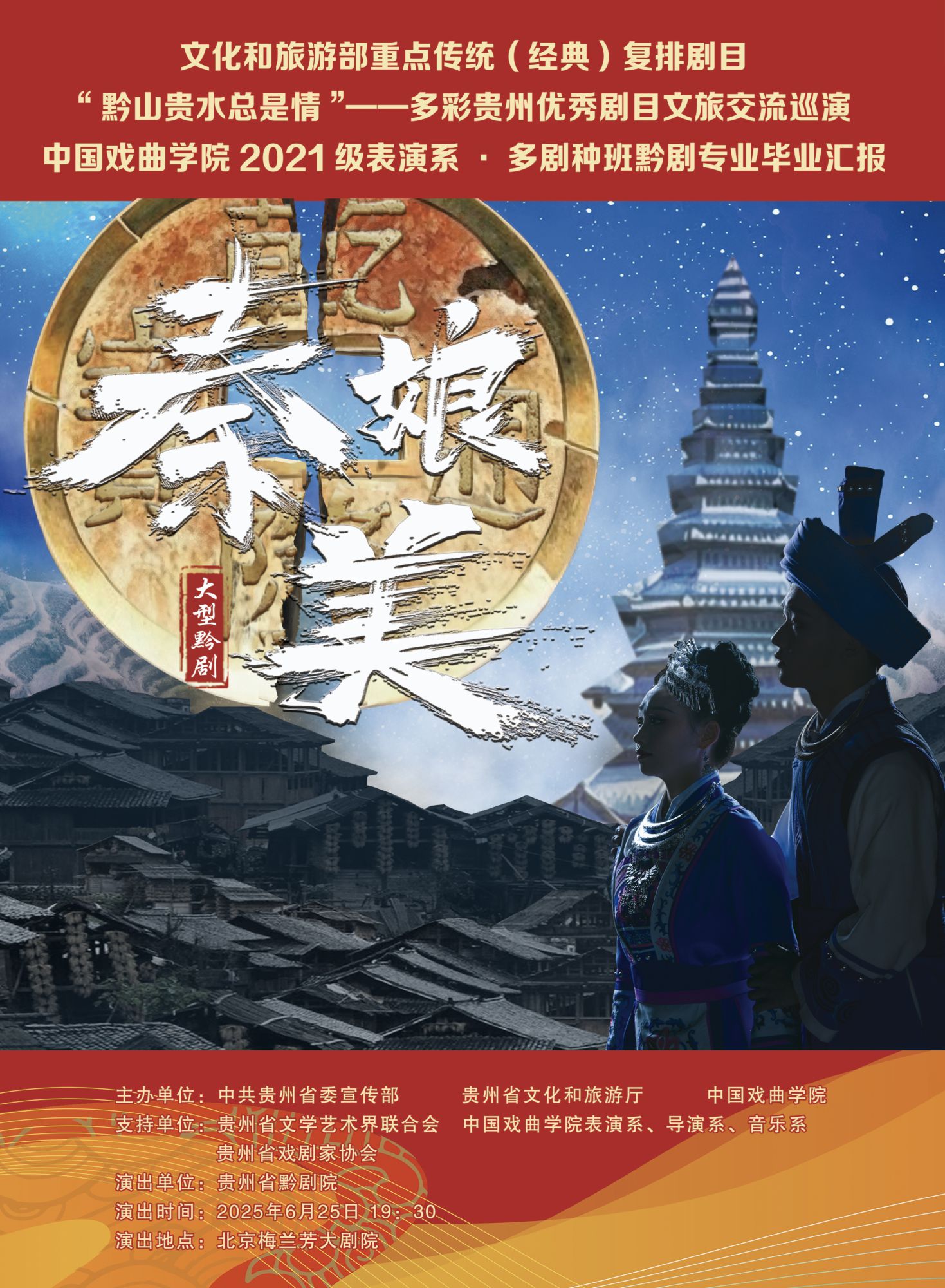 6月25-26號,文化和旅游部重點傳統(經典)劇目復排計劃新編黔劇《秦娘美》在北京梅蘭芳大劇院精彩上演,作為多彩貴州優秀劇目文旅交流巡演,同時也是中國戲曲學院表演系2021級多劇種(黔劇)表演專業畢業匯報演出,現場掌聲雷動,氣氛熱烈。吸引眾多戲迷、文化界人士以及市民前來觀看,共同領略國家級非遺黔劇的獨特藝術魅力。