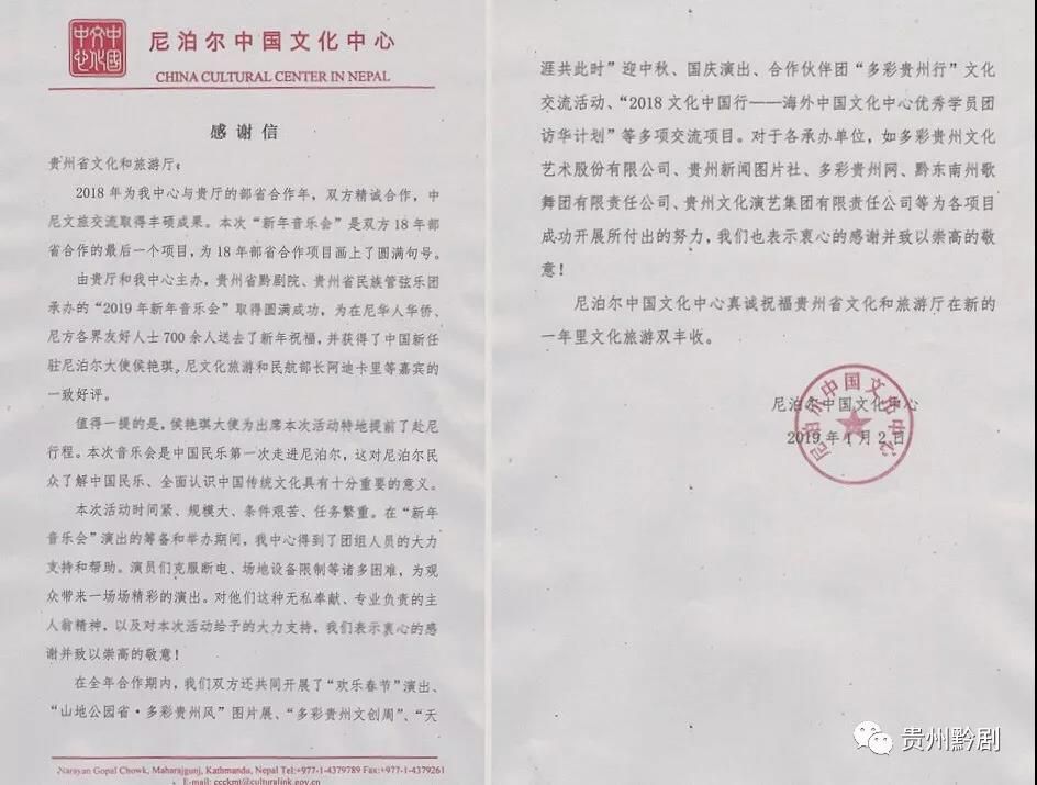 2019年1月2日,尼泊爾中國文化中心發(fā)來“感謝信”,對(duì)貴州省黔劇院、貴州省民族管弦樂團(tuán)在尼泊爾的演出成功表示祝賀,對(duì)我方演出人員的敬業(yè)精神表示崇高的敬意,演出獲得了中國新任駐尼泊爾大使候艷琪、尼文化旅游和民航部長阿迪卡里等嘉賓的一致好評(píng)。