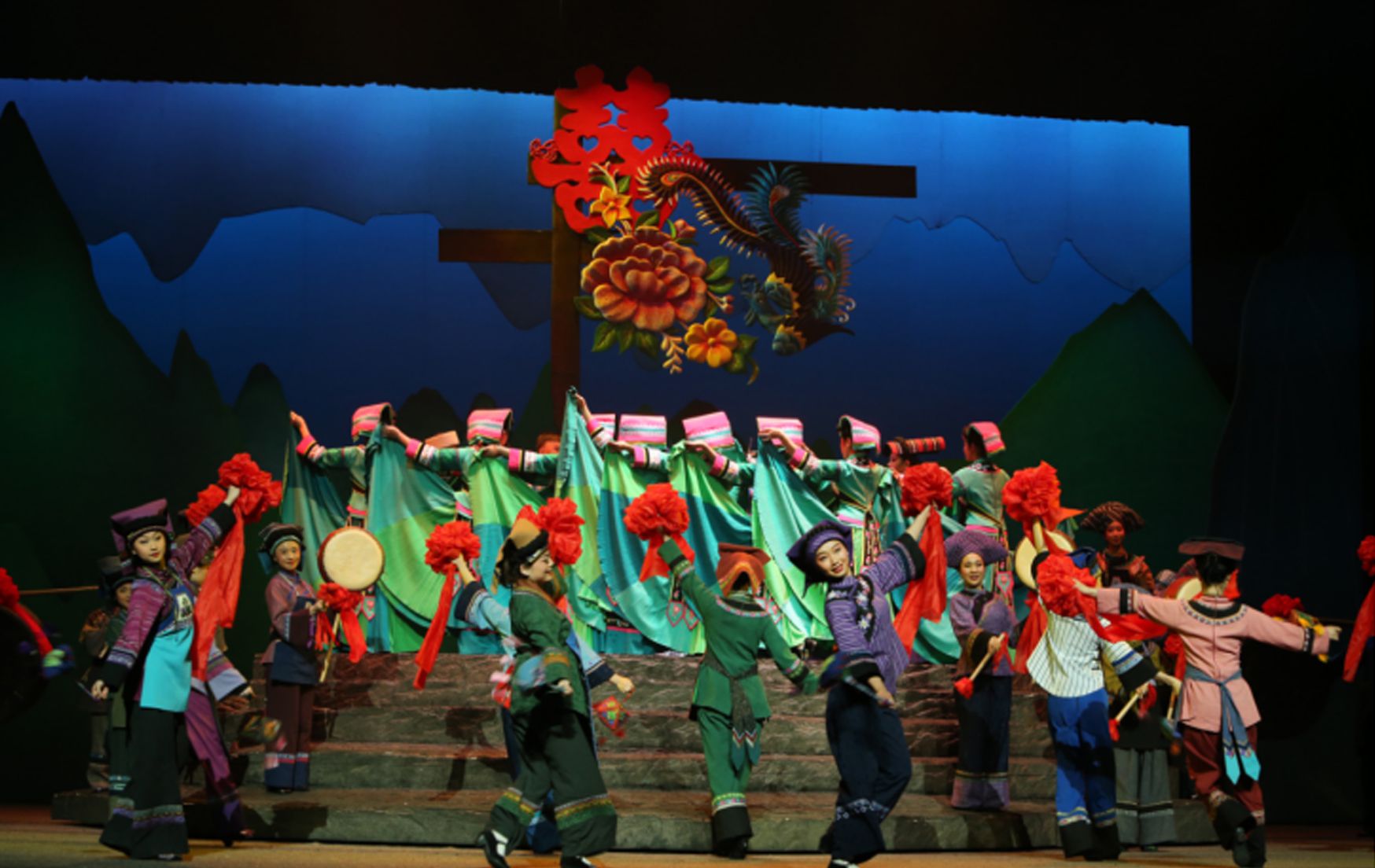黔劇作為貴州傳統地方戲曲劇種、國家級非物質文化遺產,黔劇《臘梅迎香》也展現出獨特的魅力。在創作過程中,該劇引入了更多貴州元素。無論是舞臺、服裝還是念白、唱腔等都極具貴州特色,尤其是在《臘梅迎香》的編曲上,該劇選用了《好花紅》作為這部戲的音樂素材,并結合主人公的人物性格將原來的《好花紅》歌曲做了調整,使曲調更高昂,既突出地方特色,又更好貼合劇作。