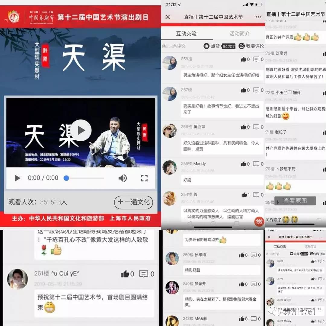 第十二屆中國藝術(shù)節(jié)上,黔劇《天渠》連續(xù)兩場的專場演出及黔劇折子戲惠民首場演出引起了社會和媒體的廣泛關(guān)注,精彩的演出用真情實感打動了觀眾,演出網(wǎng)絡(luò)直播現(xiàn)場,觀演人數(shù)最新統(tǒng)計已經(jīng)突破50多萬人,收獲全國觀眾好評無數(shù)。其中中央電視臺、上海東方衛(wèi)視、新民晚報、貴州電視臺、貴州日報等十幾家中央及上海本地和貴州媒體進行了采訪、宣傳和報道。中新社網(wǎng)站、中國新聞網(wǎng)、搜狐、騰訊、深圳新聞網(wǎng)、成都新聞網(wǎng)等媒體進行首發(fā)和轉(zhuǎn)載,演出現(xiàn)場由“一通文化”平臺以及光明網(wǎng)進行網(wǎng)絡(luò)同步直播。《天渠》演出進行同步直播同時也開創(chuàng)了“文華獎”演出劇目之先河。