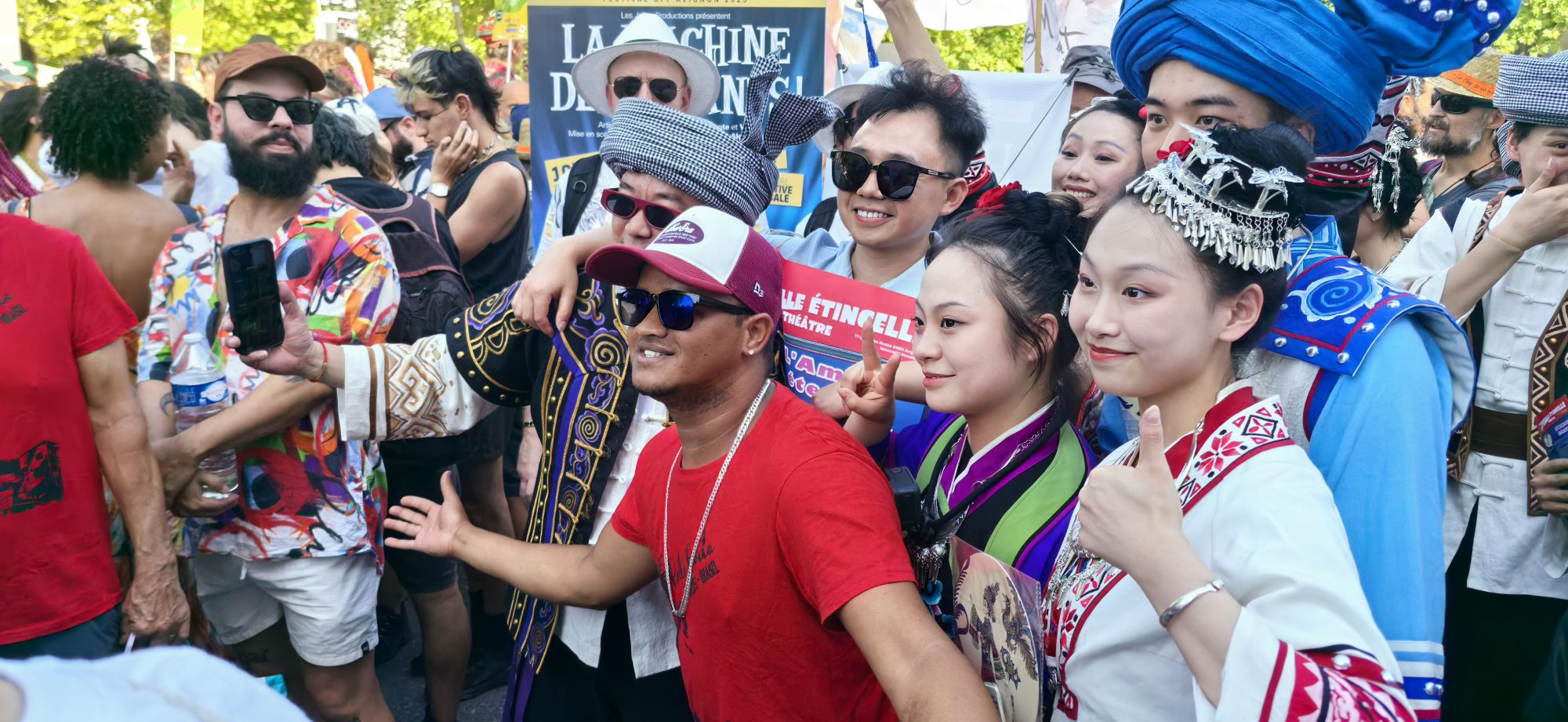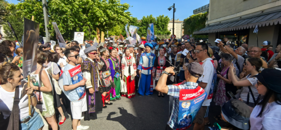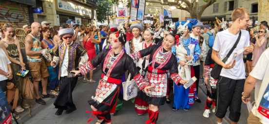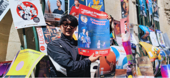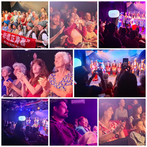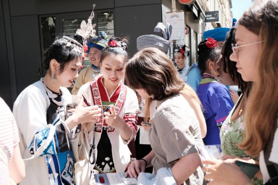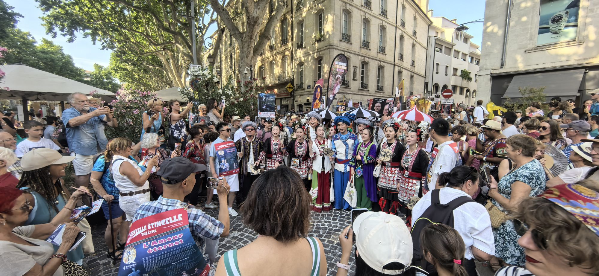 “Qin Niangmei, a love story from Guizhou, China!”完成劇場(chǎng)演出后,黔劇演員們又來(lái)到阿維尼翁的街頭掛劇目海報(bào)、贈(zèng)送《秦娘美》文創(chuàng)紀(jì)念品,并進(jìn)行5次具有貴州民族、戲曲元素的快閃表演,將貴州戲曲文化元素,撒向這座中世紀(jì)古城的每一個(gè)角落。落。