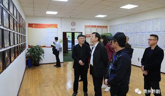 在黔劇院辦公樓大廳,謝念副部長在院榮譽墻和劇目展示墻前認真觀看并聽取介紹,對于黔劇院這些年來所取得的成績給予了充分的肯定,當朱宏院長介紹“周恩來總理題詞”時,謝念部長激動的說:“黔劇是我們的寶貝,它姓黔,我們一定要保護好、傳承好、發展好”。