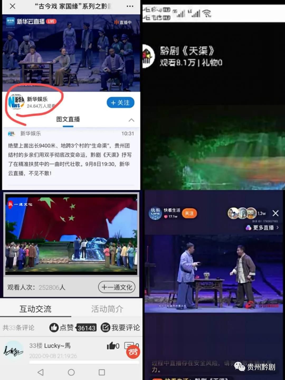 2020年9月8日晚19:30,大型脫貧攻堅題材、現實題材黔劇《天渠》準時在由中宣部、文旅部主辦的2020年全國基層戲曲院團網絡會演平臺展播。兩個小時的在線展演,黔劇《天渠》獲評無數,獲贊無數,在線觀眾人數成幾何數增長,觀看人次不斷刷新,從突破十萬再到突破百萬,演出結束經文旅部藝術司統計,觀看總量達到471.5萬觀看人次。真是震撼!這是繼2019上海十二藝節《天渠》網絡直播后,再一次代表貴州省參加全國性演出而取得的又一優異成績,展演得到全國幾百萬觀眾的認可,刷新了歷史紀錄,取得了質的飛躍。