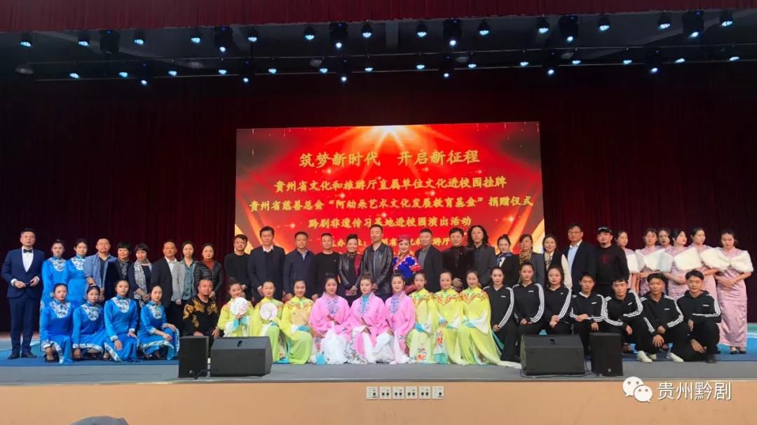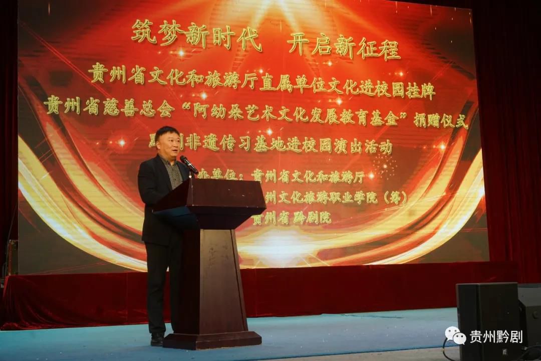 為大力弘揚中華傳統優秀文化,積極響應國家提出的培養文化自信,11月17日下午,貴州省文化和旅游廳直屬單位文化進校園掛牌、貴州省慈善總會“阿幼朵藝術文化發展教育基金”捐贈儀式、黔劇非遺傳習基地進校園演出活動在貴州省旅游學校舉行。活動以“筑夢新時代,開啟新征程”為主題,旨在認真貫徹落實黨的教育方針,進一步加強中華傳統文化教育,推動職業教育長足發展。此次掛牌的單位,涉及了貴州文化的藝術創作、研究,文藝人才的培養,圖書、文物、公共文化發展及國家級非物質文化遺產黔劇的傳習等方面。掛牌后,各單位將與貴州旅游學校一同積極探索文化傳承與教育體系建設深度融合的新模式。
